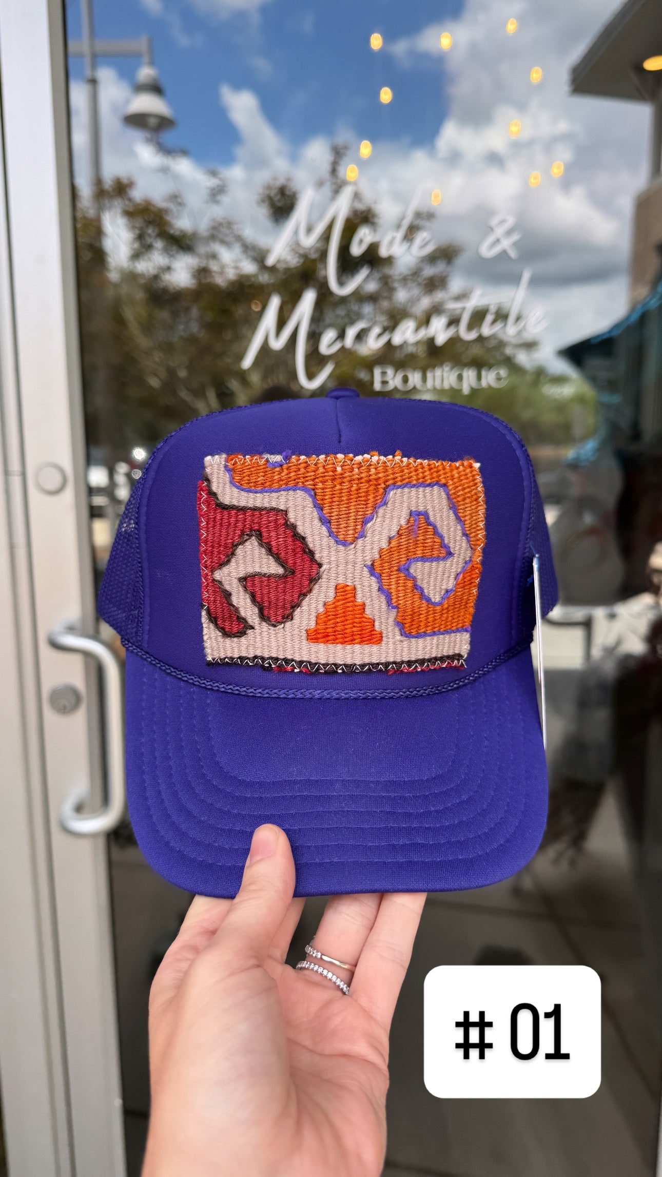 Your easy, throw-on-and-go, trucker hat with Turkish kilim patch. No two are alike! Truckers are one size hat with high crown, structured bill and mesh back with adjustable snaps.