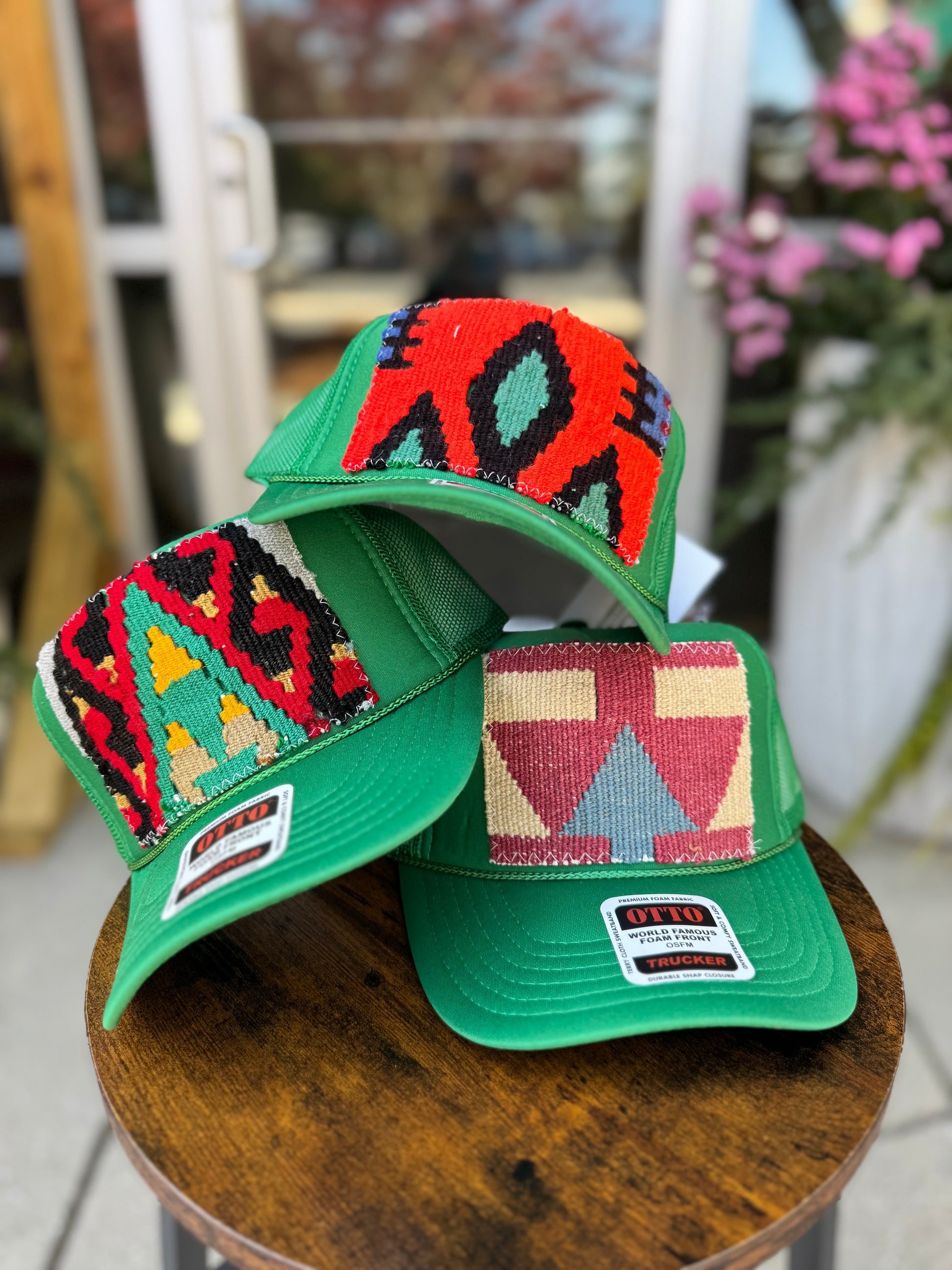 Your easy, throw-on-and-go, trucker hat with Turkish kilim patch. No two are alike! Truckers are one size hat with high crown, structured bill and mesh back with adjustable snaps.